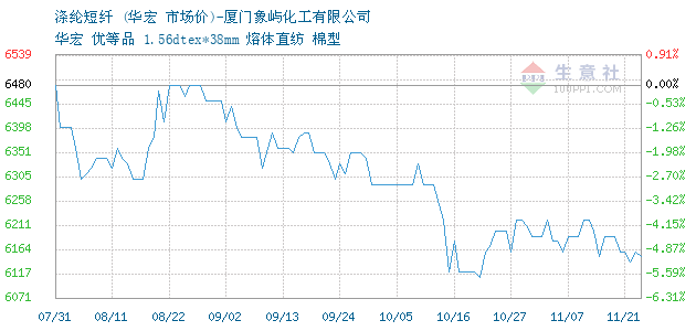 11月20日华宏关于涤纶短纤的报价为6170元/吨。涤纶短纤的规格:华宏 优等品 1.56dtex*38mm 熔体直纺 棉型 。该报价有效期为1天。报价提供方:厦门象屿化工有限公司。