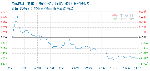 11月20日新拓关于涤纶短纤的报价为6360元/吨。涤纶短纤的规格:新拓 优等品 1.56dtex*38mm 熔体直纺 棉型 。该报价有效期为1天。报价提供方:保定纳威新材料科技有限公司。