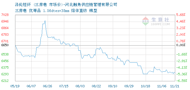 11月21日三房巷关于涤纶短纤的报价为6310元/吨。涤纶短纤的规格:三房巷 优等品 1.56dtex*38mm 熔体直纺 棉型 。该报价有效期为1天。报价提供方:河北触角供应链管理有限公司。