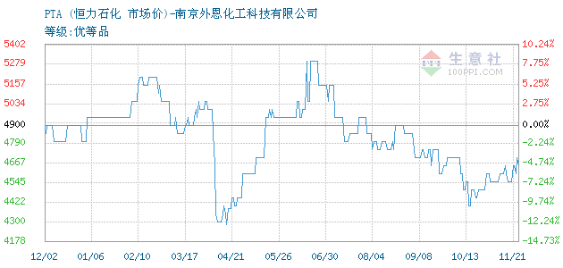 11月21日恒力石化关于PTA的报价为4650元/吨。PTA的规格:等级:优等品。该报价有效期为3天。报价提供方:南京外恩化工科技有限公司。