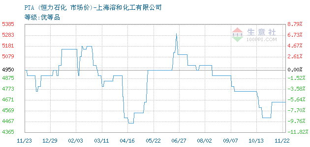 11月22日恒力石化关于PTA的报价为4650元/吨。PTA的规格:等级:优等品。该报价有效期为3天。报价提供方:上海溶和化工有限公司。