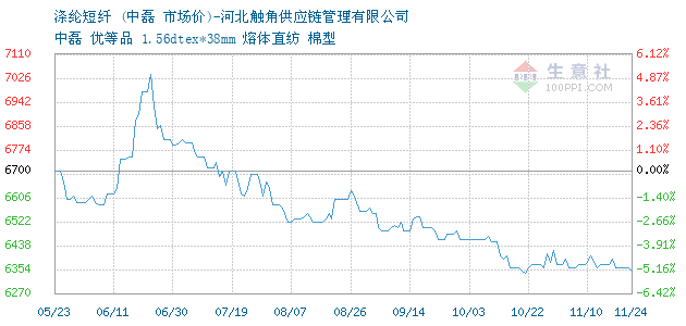 11月24日中磊关于涤纶短纤的报价为6350元/吨。涤纶短纤的规格:中磊 优等品 1.56dtex*38mm 熔体直纺 棉型 。该报价有效期为1天。报价提供方:河北触角供应链管理有限公司。