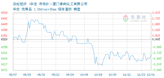 11月24日华宏关于涤纶短纤的报价为6220元/吨。涤纶短纤的规格:华宏 优等品 1.56dtex*38mm 熔体直纺 棉型 。该报价有效期为1天。报价提供方:厦门象屿化工有限公司。