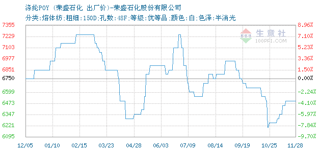 11月24日荣盛石化关于涤纶POY的报价为6500元/吨。涤纶POY的规格:分类:熔体纺;粗细:150D;孔数:48F;等级:优等品;颜色:白;色泽:半消光。该报价有效期为7天。报价提供方:荣盛石化股份有限公司。