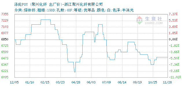 11月24日聚兴化纤关于涤纶POY的报价为6500元/吨。涤纶POY的规格:分类:熔体纺;粗细:150D;孔数:48F;等级:优等品;颜色:白;色泽:半消光。该报价有效期为7天。报价提供方:浙江聚兴化纤有限公司。