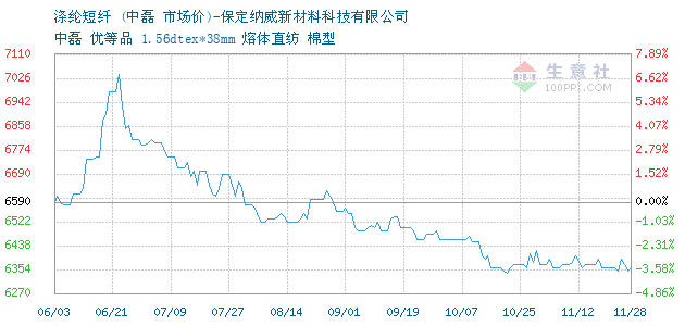 11月24日中磊关于涤纶短纤的报价为6350元/吨。涤纶短纤的规格:中磊 优等品 1.56dtex*38mm 熔体直纺 棉型 。该报价有效期为1天。报价提供方:保定纳威新材料科技有限公司。