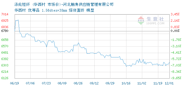 11月24日华西村关于涤纶短纤的报价为6300元/吨。涤纶短纤的规格:华西村 优等品 1.56dtex*38mm 熔体直纺 棉型 。该报价有效期为1天。报价提供方:河北触角供应链管理有限公司。