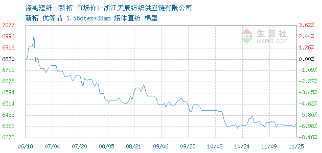 11月25日新拓关于涤纶短纤的报价为6380元/吨。涤纶短纤的规格:新拓 优等品 1.56dtex*38mm 熔体直纺 棉型 。该报价有效期为1天。报价提供方:浙江天辰纺织供应链有限公司。