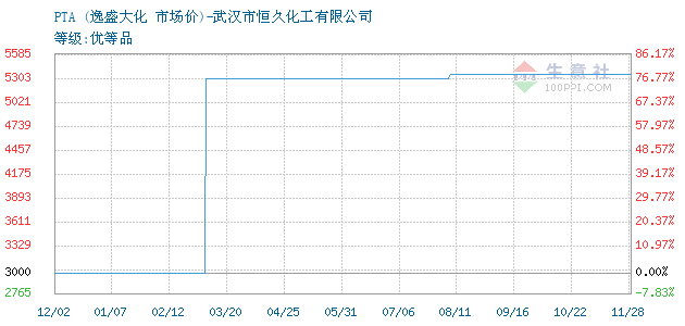 11月25日逸盛大化关于PTA的报价为5350元/吨。PTA的规格:等级:优等品。该报价有效期为1天。报价提供方:武汉市恒久化工有限公司。