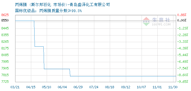 11月25日斯尔邦石化关于丙烯腈的报价为7800元/吨。丙烯腈的规格:国标优级品;丙烯腈质量分数≥99.5%。该报价有效期为3天。报价提供方:青岛盛泽化工有限公司。