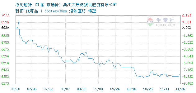 11月26日新拓关于涤纶短纤的报价为6360元/吨。涤纶短纤的规格:新拓 优等品 1.56dtex*38mm 熔体直纺 棉型 。该报价有效期为1天。报价提供方:浙江天辰纺织供应链有限公司。