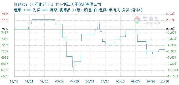 11月28日浙江天圣化纤有限公司关于涤纶FDY的报价为7150元/吨。涤纶FDY的规格:粗细:150D;孔数:96F;等级:优等品(AA级);颜色:白;色泽:半消光;分类:熔体纺。该报价有效期为3天。报价提供方:浙江天圣化纤有限公司。