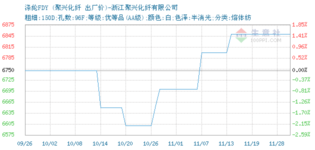 11月28日聚兴化纤关于涤纶FDY的报价为6850元/吨。涤纶FDY的规格:粗细:150D;孔数:96F;等级:优等品(AA级);颜色:白;色泽:半消光;分类:熔体纺。该报价有效期为3天。报价提供方:浙江聚兴化纤有限公司。