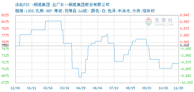11月28日桐昆集团关于涤纶FDY的报价为7150元/吨。涤纶FDY的规格:粗细:150D;孔数:96F;等级:优等品(AA级);颜色:白;色泽:半消光;分类:熔体纺。该报价有效期为7天。报价提供方:桐昆集团股份有限公司。