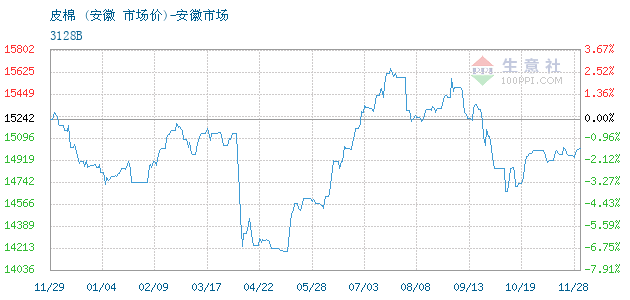 11月28日安徽地区关于皮棉的报价为15008元/吨。皮棉的规格:3128B。该报价有效期为1天。报价提供方:安徽市场。