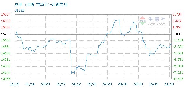 11月28日江西地区关于皮棉的报价为14968元/吨。皮棉的规格:3128B。该报价有效期为1天。报价提供方:江西市场。