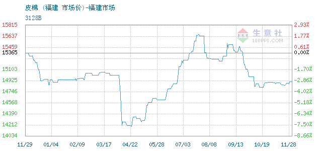 11月28日福建地区关于皮棉的报价为14906元/吨。皮棉的规格:3128B。该报价有效期为1天。报价提供方:福建市场。