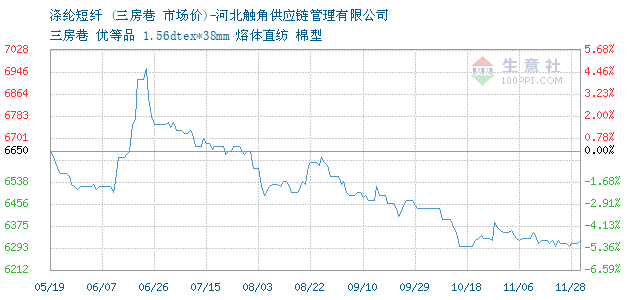 11月28日三房巷关于涤纶短纤的报价为6320元/吨。涤纶短纤的规格:三房巷 优等品 1.56dtex*38mm 熔体直纺 棉型 。该报价有效期为1天。报价提供方:河北触角供应链管理有限公司。