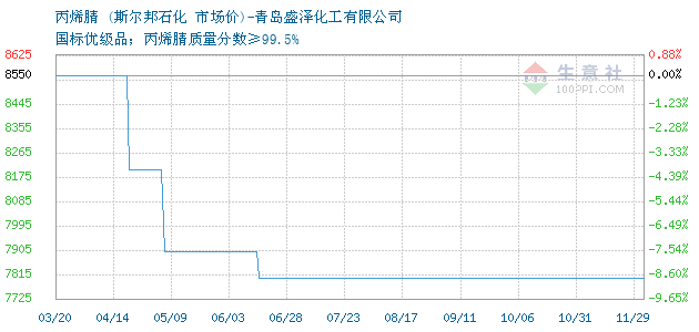 11月29日斯尔邦石化关于丙烯腈的报价为7800元/吨。丙烯腈的规格:国标优级品;丙烯腈质量分数≥99.5%。该报价有效期为3天。报价提供方:青岛盛泽化工有限公司。