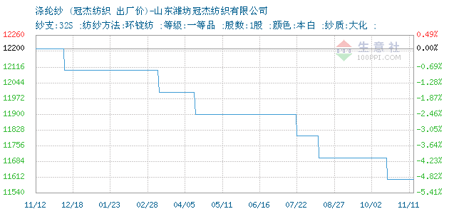 11月07日潍坊冠杰纺织有限公司关于32S涤纶纱的报价为11600元/吨。32S涤纶纱的规格:纱支:32S ;纺纱方法:环锭纺 ;等级:一等品 ;股数:1股 ;颜色:本白 ;纱质:大化 ;。该报价有效期为3天。报价提供方:山东潍坊冠杰纺织有限公司。
