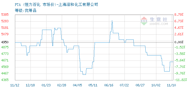 11月09日恒力石化关于PTA的报价为4650元/吨。PTA的规格:等级:优等品。该报价有效期为3天。报价提供方:上海溶和化工有限公司。