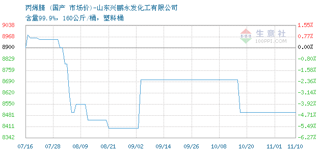 11月09日国产关于丙烯腈的报价为8500元/吨。丙烯腈的规格:含量99.9%,160公斤/桶,塑料桶。该报价有效期为3天。报价提供方:山东兴鹏永发化工有限公司。
