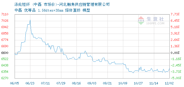 12月02日中磊关于涤纶短纤的报价为6400元/吨。涤纶短纤的规格:中磊 优等品 1.56dtex*38mm 熔体直纺 棉型 。该报价有效期为1天。报价提供方:河北触角供应链管理有限公司。
