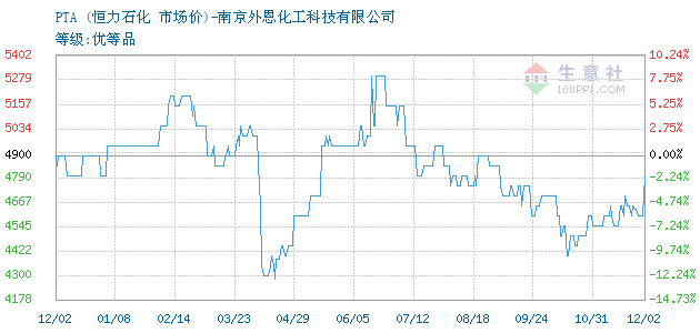 12月02日恒力石化关于PTA的报价为4800元/吨。PTA的规格:等级:优等品。该报价有效期为3天。报价提供方:南京外恩化工科技有限公司。