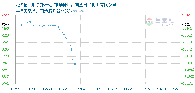12月03日斯尔邦石化关于丙烯腈的报价为8200元/吨。丙烯腈的规格:国标优级品;丙烯腈质量分数≥99.5%。该报价有效期为3天。报价提供方:济南金日和化工有限公司。
