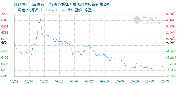 12月05日三房巷关于涤纶短纤的报价为6330元/吨。涤纶短纤的规格:三房巷 优等品 1.56dtex*38mm 熔体直纺 棉型 。该报价有效期为1天。报价提供方:浙江天辰纺织供应链有限公司。