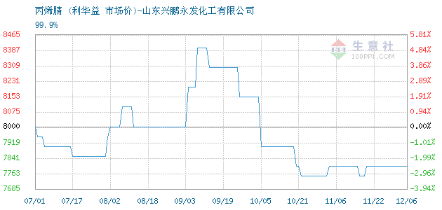 12月06日利华益关于丙烯腈的报价为7800元/吨。丙烯腈的规格:99.9%。该报价有效期为3天。报价提供方:山东兴鹏永发化工有限公司。