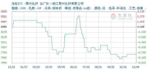 12月08日聚兴化纤关于涤纶DTY的报价为7750元/吨。涤纶DTY的规格:粗细:150D ;孔数:48F ;分类:熔体纺 ;等级:优等品(AA级) ;颜色:白 ;色泽:半消光 ;工艺:低弹 ;。该报价有效期为7天。报价提供方:浙江聚兴化纤有限公司。