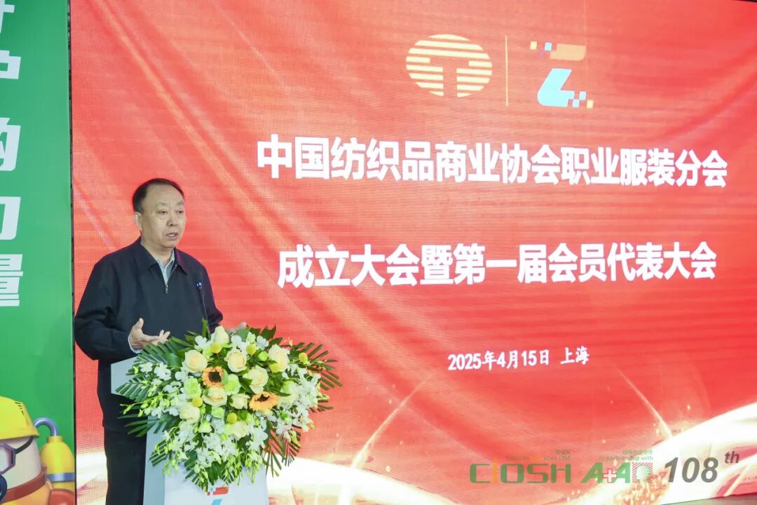 2025年4月15日,中国纺织品商业协会职业服装分会成立大会暨第一届会员代表大会在上海新国际博览中心隆重举行。来自全国60余家会员单位代表、行业权威专家及领导嘉宾等百余位齐聚一堂,共同见证中国职业服装产业迈向规范化、专业化、国际化的历史性时刻。