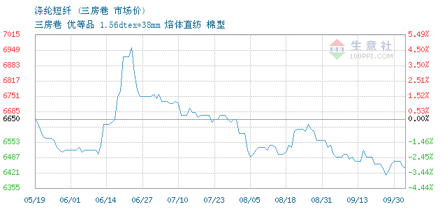 09月29日三房巷关于涤纶短纤的报价为6480元/吨。涤纶短纤的规格:三房巷 优等品 1.56dtex*38mm 熔体直纺 棉型 。该报价有效期为1天。报价提供方:浙江天辰纺织供应链有限公司。