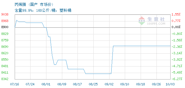09月30日国产关于丙烯腈的报价为8700元/吨。丙烯腈的规格:含量99.9%,160公斤/桶,塑料桶。该报价有效期为3天。报价提供方:山东兴鹏永发化工有限公司。